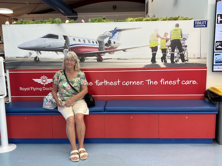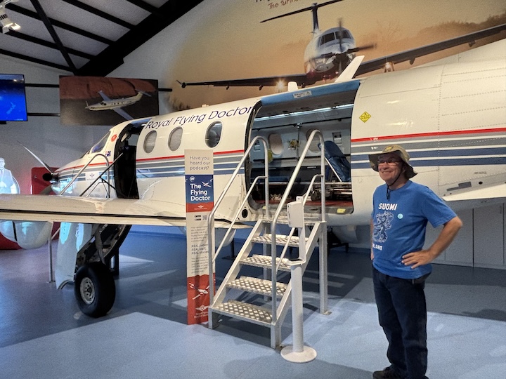 Satamalaiturilta löytyi myös toinen halli, joka esitelee Australian ilmailuhistoriaa, ja erityisesti Royal Flying Doctors -järjestön, Lentävät lääkärit, toimintaa. Onhan selvää, että Australian kokoisessa maassa ihmiset asuvat pitkien etäisyyksien päässä. Meillä on paljon eimitään, sanoi opaskin. Ainut tapa saada lääkäri paikalle tai potilas hoitoon, on tehdä se lentokoneella.