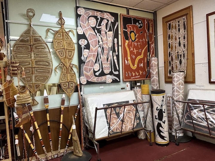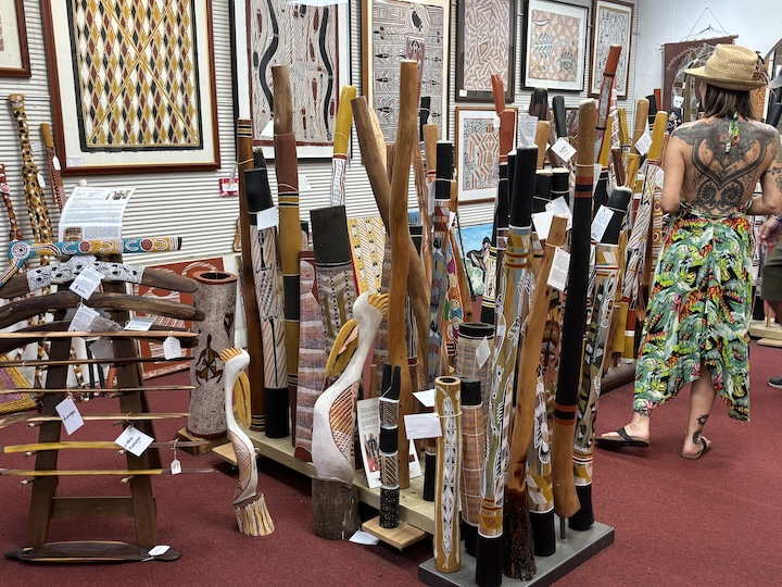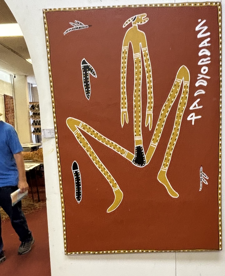 Kaupungilla kävellessämme osui silmiin mainos Aboriginal taidenäyttelystä. Jyrkät rappuset ylös toiseen kerrokseen, ja sieltä löytyi aivan upea kokoelma värikästä, hyvin omaperäistä ja ainutlaatuista taidetta. Suuria kankaita, pieniä kankaita, veistoksia ja punoksia. Kaikki myynnissä, ja varsin korkein hinnoin.