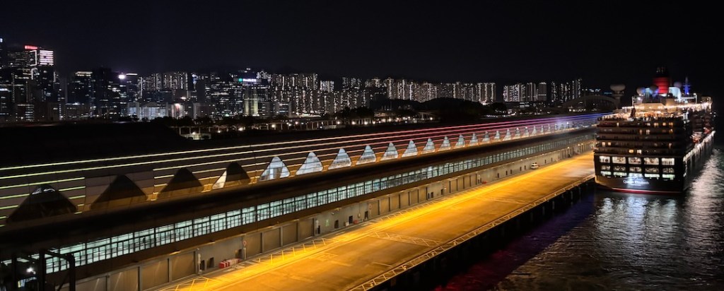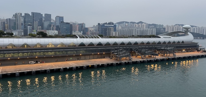 Vuonna 1991 laskeuduimme Hong Kongin kuuluisalle kapealle kiitoradalle. 1997 lentokenttä siirrettiin väljempiin maisemiin ja lentokentästä tehtiin laituri risteilyaluksille. Laituriin saapui myös Queen Elizabeth, joten Kai Tak Cruise terminaalin laiturissa komeili kaksi Cunardin alusta peräkkäin, ja olisi varmaan mahtunut kolmaskin. Uusi upea terminaalirakennus on rakennettu lähes koko kiitoradan pituiseksi, ainakin melkein, eli 850 metriä, ja päästäkseen laivaan ja laivalta pois, piti kiemurrella sen käytäviä edestakaisin moneen kertaan. Kattotasanteelta löytyi kauniit istutukset, ravintoloja ja kauppoja, kaikki kiinni ja vain muutama harva laivoilta sinne uteliaisuuttaan eksynyt turisti.