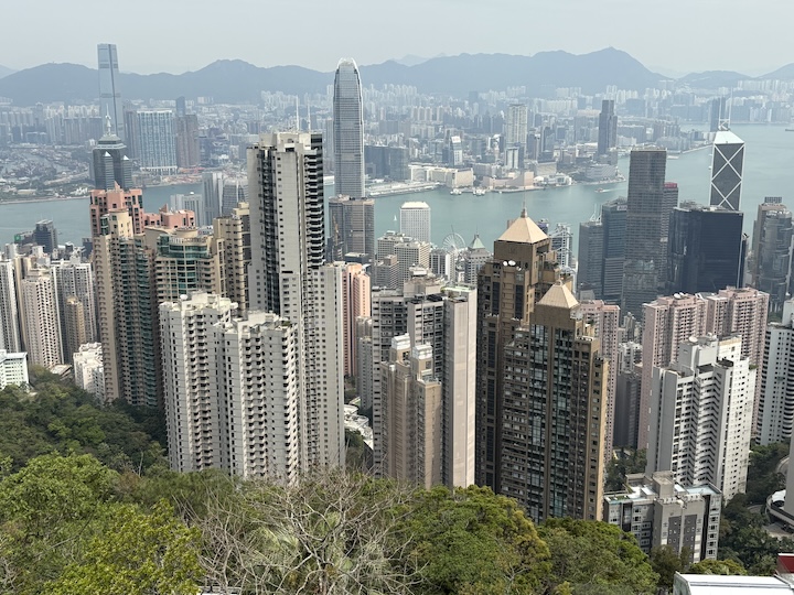 Victoria Peak on se pakollinen kohde, jonne turistibussit kulkevat ylös ja alas noin puolitoistakaistaista serpentiinitietä. Sinne vie myös kuuluisa tram, kaapelivaunu. Kyllä, näkymät olivat mahtavat.