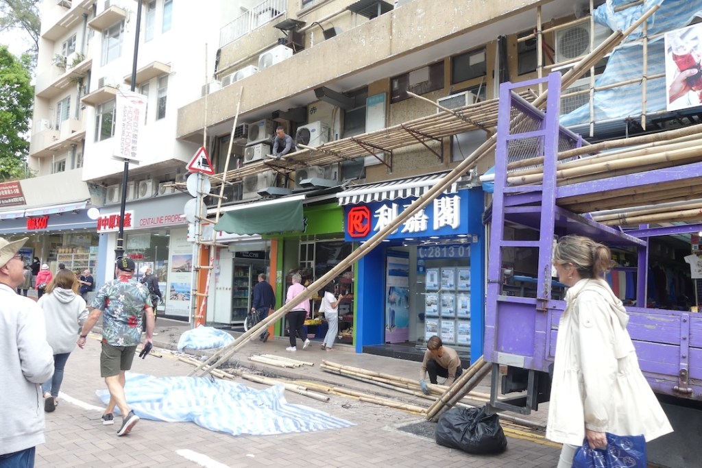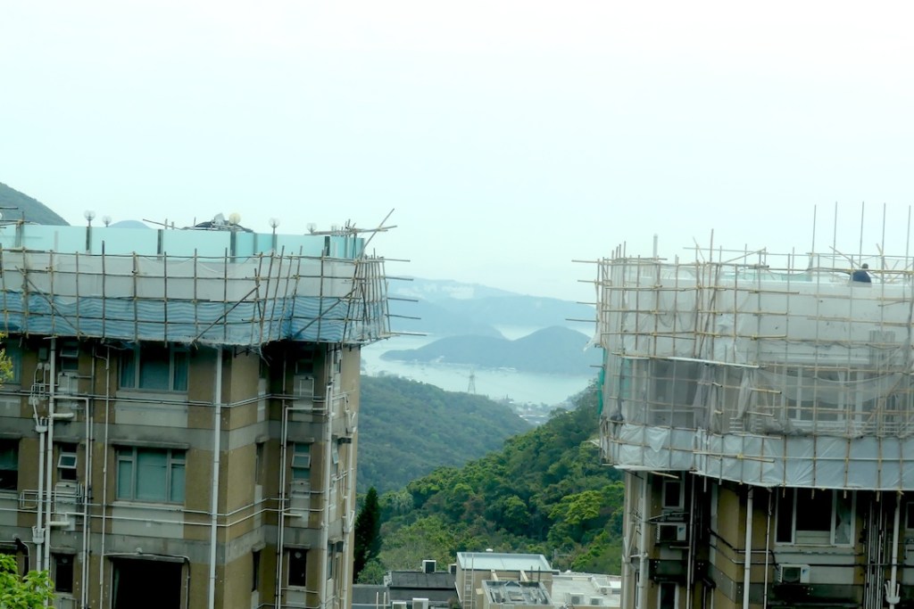 Hong Kongissa edelleen rakennetaan ja korkealle. Rakennustelineet? Nauhoilla yhteen sidottuja bambukeppejä. Tulitikkutaloja näkyi kaikkialla, kaiken korkuisia ja kaiken kokoisia. Varmasti on hyväksi ja halvaksi materiaaliksi havaittu.