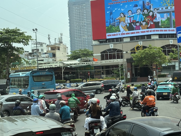 Päivän valjetessa Queen Anne lipui hyvän matkaa ylös Thi Vai jokea ja asettui laituriin Phu Myn satamassa. Pitkä bussirivistö odotteli laiturilla. Satama on vain satama, mielenkiinnon kohde Saigon, Ho Chi Minh City, oli kahden tunnin ajomatkan päässä. Olimme vaihtaneet Austraaliasta jäännet 50 dollaria ja nyt meillä oli 600.000 paikallista rahaa taskussa!
