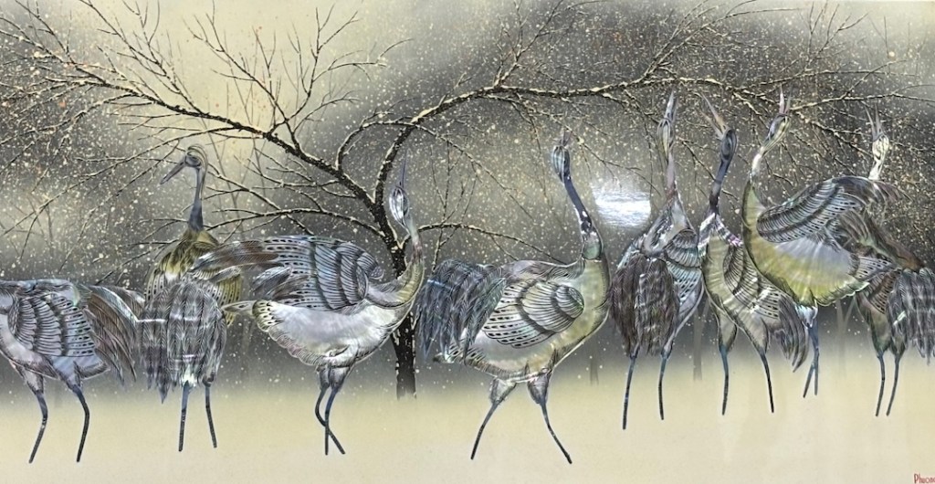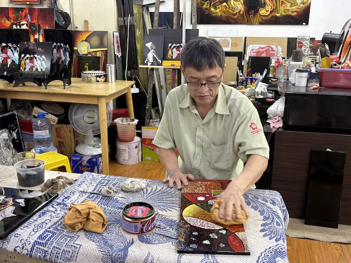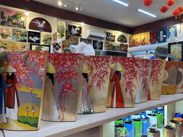Paikallinen kästityötaito tuli komeasti esille taidekaupassa, jossa kuviot koottiin puulevyille simpukkojen helmiäisestä, värjättiin, lakattiin ja hiottiin, kaikkiaan 17 kertaa. Upeita taideteoksia!