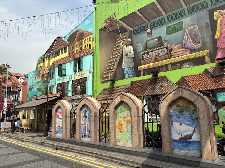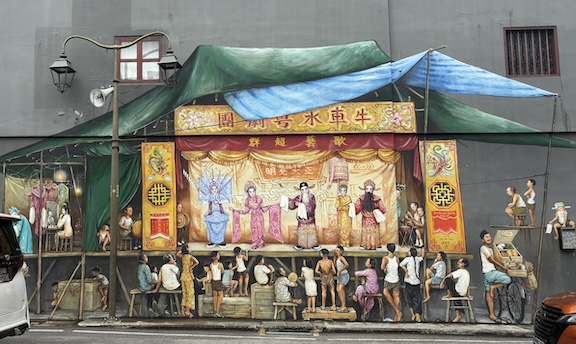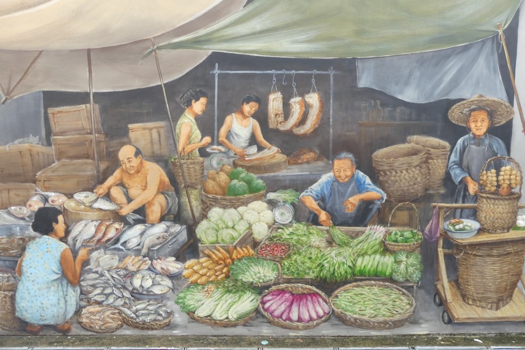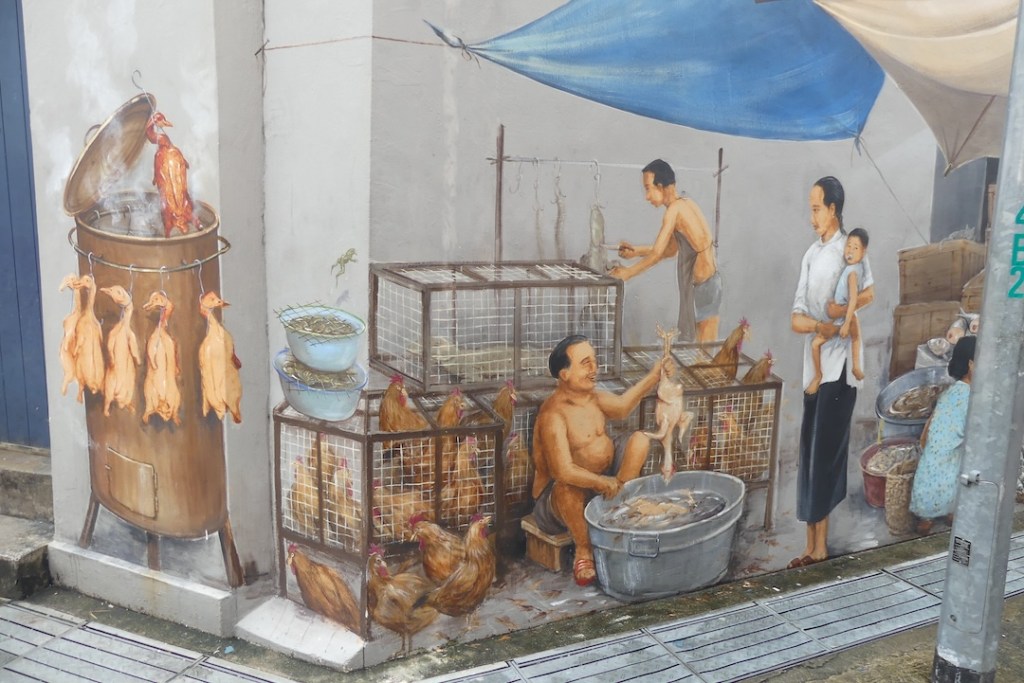 Kävelykierros Chinatownissa eli kiinalaisten kaupunginosassa ei tuottanut pettymystä. Katujen ja kujien seinät on peitetty paikallisten taiteilijoitten tilaustöinä tekemiin maalauksiin, jotka kertovat esim. kiinalaisesta teatterista ja yleensä ihmisten jokapäiväisestä elämästä ja työnteosta menneinä aikoina.