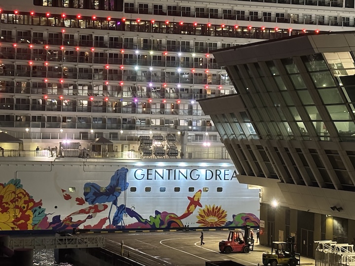 Tutustuimme kaupunkiin kahden päivän ajan, yöpyen laivassa omassa hytissämme. Toisen päivän aamuna sain hädin tuskin raotettua toista silmääni, kun parvekkeemme eteen lipui suunnaton seinä punaisia ja valkoisia vilkkuvia valoja. Sehän oli Singaporen oma risteilyalus, Genting Dream, joka kiinnittyi viereiseen laituriin, purki valtavan määrän matkustajia ja laukkuja terminaaliin, lastasi uudet, ja oli lähtenyt jo kun me iltapäivällä palasimme laivallemme.