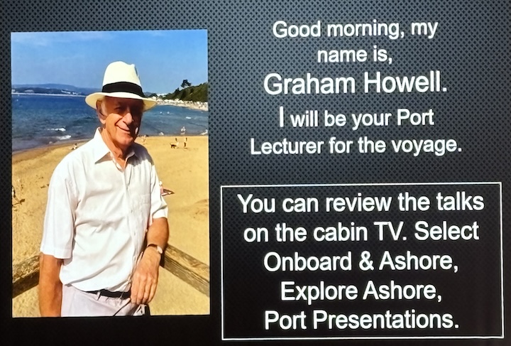Muutama päivä ennen jokaista satamaa saamme kuulla esitelmän paikan sijainnista, historiasta ja tarjolla olevista retkistä. Tällä risteilyllä nuo puheet ovat olleet hyvin perusteellisia ja valaisevia. Lainaan tähän pari kuvaa, mitkä kertovat enemmän kuin monta sanaa.