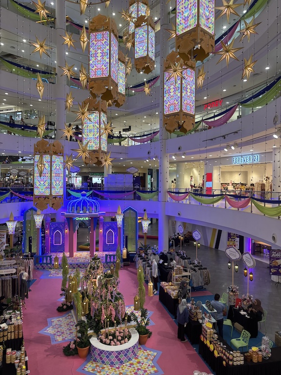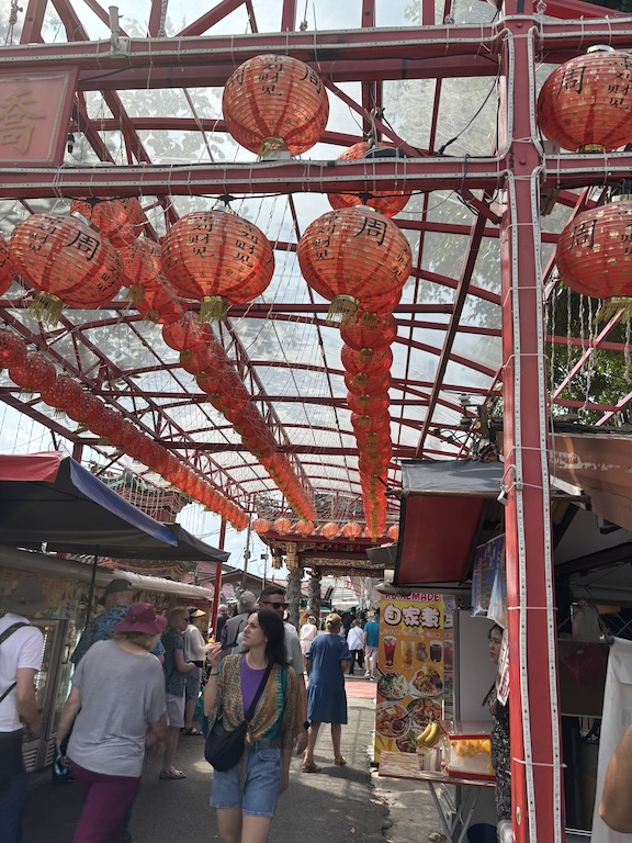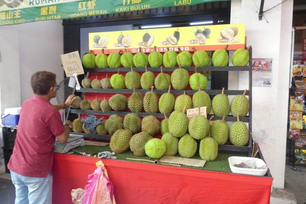 Herkullisen näköisiä hedelmiä ja niitä kuuluisia Durianeja, jotka hajun perusteella havaitsi jo kaukaa. Vieressä oli kojukujia, joissa oli saatavana vaatetta, kenkiä, ja kaikkea koristetta maan ja taivaan väliltä.