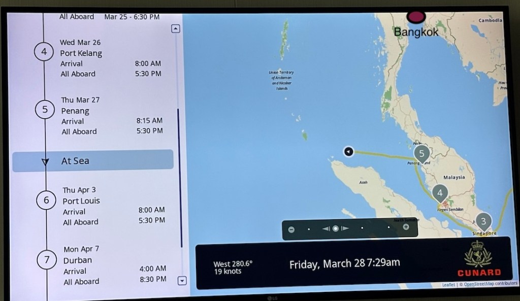 Lopulta sanoimme hyvästit Aasian kohteille. Edessä on viikko merellä läpi Intian valtameren, kohteena Mauritiuksen saari Madagascarin kupeessa, ja sen vieressä toinenkin pieni saari Reunion, jonne Queen Anne aikoo mennä ensi vuonna.