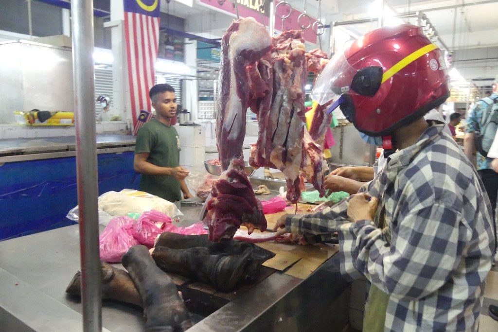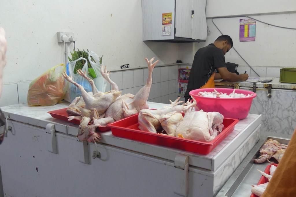 Letkassa marssimme pitkin kauppojen reunustamia katuja. Vastassa oli Wet Market, eli kauppahalli täynnä lihaa, kanaa ja kalaa. Oli menossa hurja ruhojen pilkkominen, kananjalkojen katkominen, kalojen perkaus, jne.