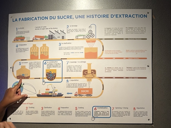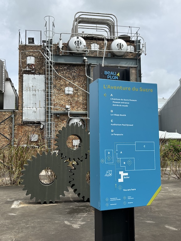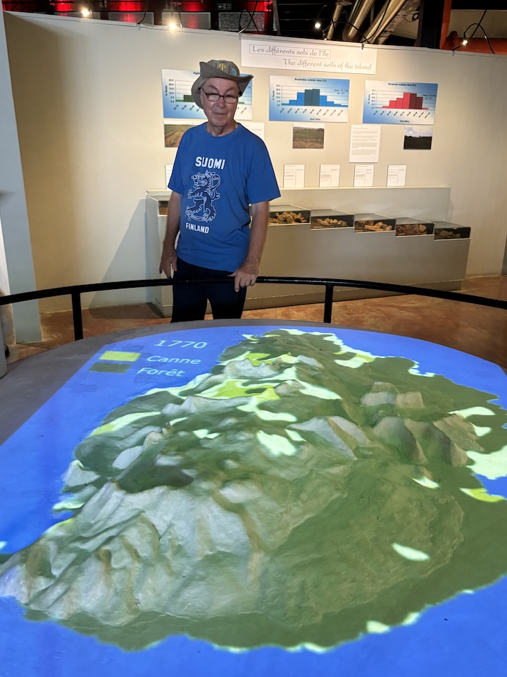 Teimme kierroksen sokeritehtaassa, L´Aventure du Sucre. Vuonna 1760 Mauritiuksen saarella tummanvihreä metsä peitti saaren. Parisataa vuotta myöhemmin vaaleanvihteät sokeriruokoviljelmät ovat vallaanneet alan.