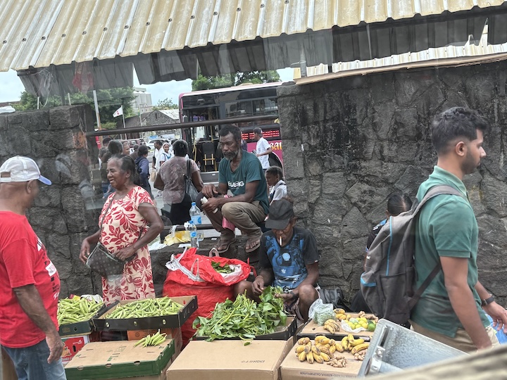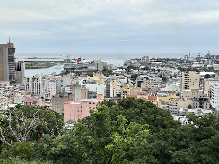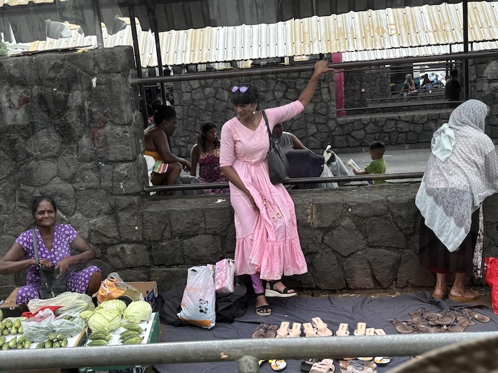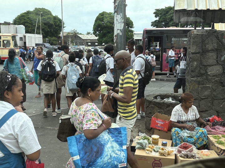 Kaupunki ja sen kapeat kiemuraiset kadut eivät vastaa nykyiseen auto ja ihmismäärään. Satamaan kiemurtelimme kapeita kujia pitkin, kaikki satakunta suurta turistibussia. Osuimme ajamaan Port Louisin keskustan bussiaseman ohi juuri koulujen ja työpäivän päättymisen aikaan. Ihmettelin ensin, mikä ihme ihmispaljous olikaan kokoontunut alueelle. Tavaraa myytiin kaduilla suoraan laatikoista ja maasta. Opas kertoi, että bussikuljetus kouluista ja työstä on ilmainen ja sitä käytetään sankoin joukoin, ja missä on ihmisiä, on myös kauppiaita.