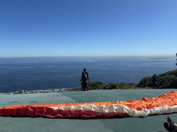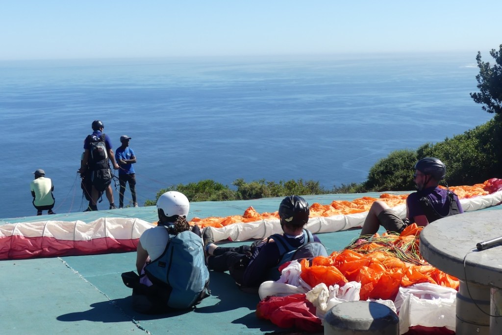 Riippuliitäjät varjoineen lähtivät lentoon lähes jonossa leijailemaan vuoren reunalta.