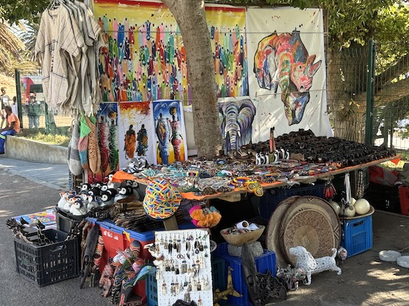 Matkalla sinne ja takaisin kuljimme matkamuistoja myyvien kojujen välitse. Pientä ja suurta, afrikkalaista. Eikä maksanut paljon. Jokaiselle jotakin, vaikka ei tarvitsisi yhtään mitään.