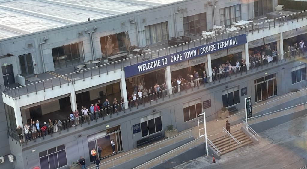Etelä-Afrikkaan mennessä jonotimme passintarkastukseen kuten lentokentillä tehdään, kaikki lähes 5000 ihmistä laivalta yhtaikaa, kapteeni mukaanlukien. Passimme leimattiin. Lähtiessämme tapahtui sama uudelleen. Jono kiersi kaksi tuntia terminaalin edustalla, kunnes viimeinenkin sielu laivasta oli saanut lähtöleimansa. Kuten aina, laivan lähtöä seuraamaan oli saapunut joukko paikallisia. Haikein mielin ja hyvin muistoin sanoimme hyvästit Kap-kaupungille. Paljon jäi näkemättä ja kokematta tästä kauniista ja mielenkintoisesta paikasta, mutta kahdessa tiiviissä päivässä paljon ehdittiin nähdäkin. Matka jatkuu, seuraava satama on Namibiassa.
