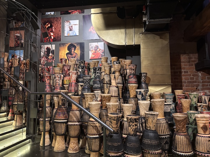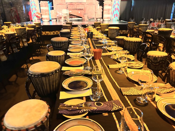 Pitkät pöydät oli katettu kauniisti afrikkalaisin maanvärein, ruskeaa, oranssia, terrakottaa. Jokaisella tuolilla odotti rumpu, ja saimmekin varsin huumoripitoisen oppitunnin afrikkalaisesta rummutuksesta. Tässäkin paikassa meidänkin turistiryhmä otettiin vastaan iloisesti, luontevasti, sydämellisesti. Shown vetäjät osoittivat loistavaa huumorintajua, ruoka ja juomat tarjottiin sujuvasti ja todella ystävällisesti.