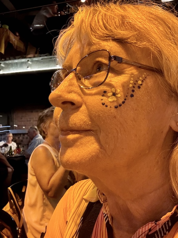 14 lajin ruokalista oli tosi herkullista syötävää Etelä-Afrikkalaisten viinien ja tanssiesitysten höystämänä. Saimme myös asiaankuuluvan kasvomaalauksen. Paikan varsin vahva kellanrusea valaistus oli tunnelmallinen, mutta värjää kuvat kultaisiksi.