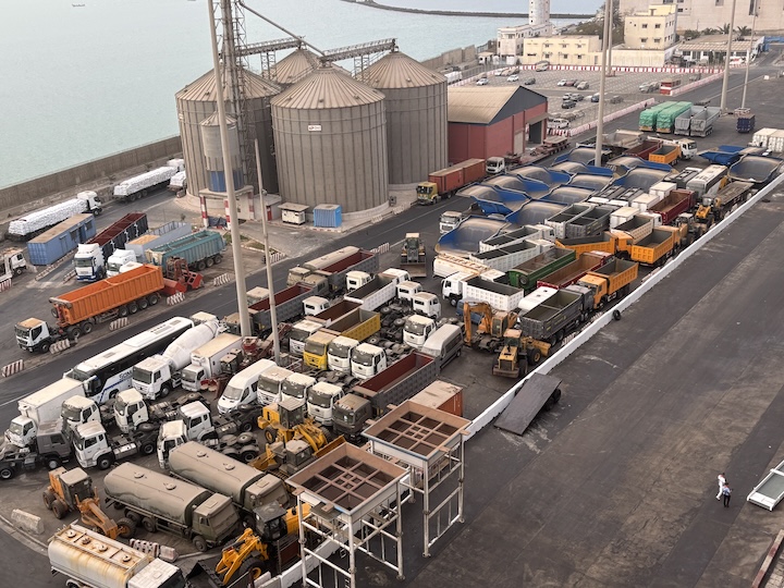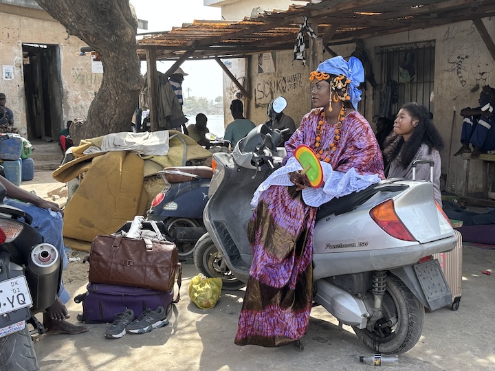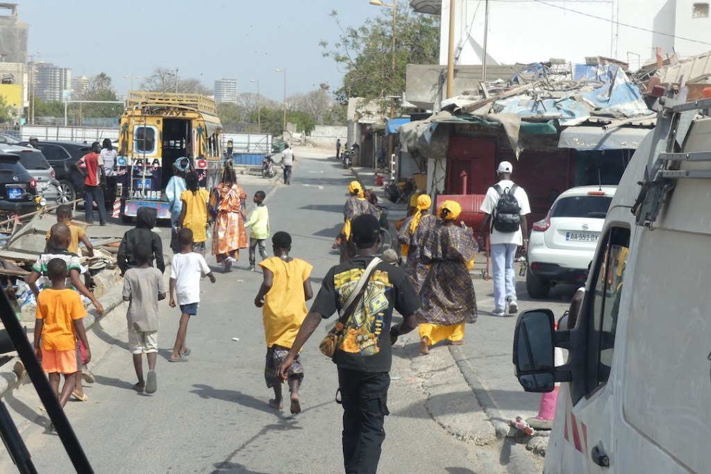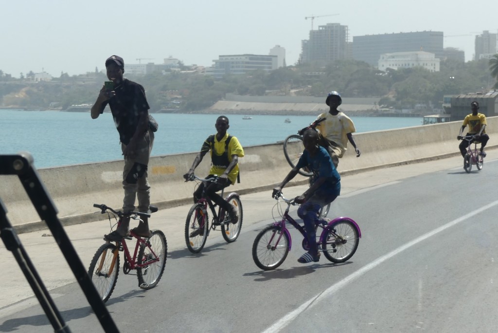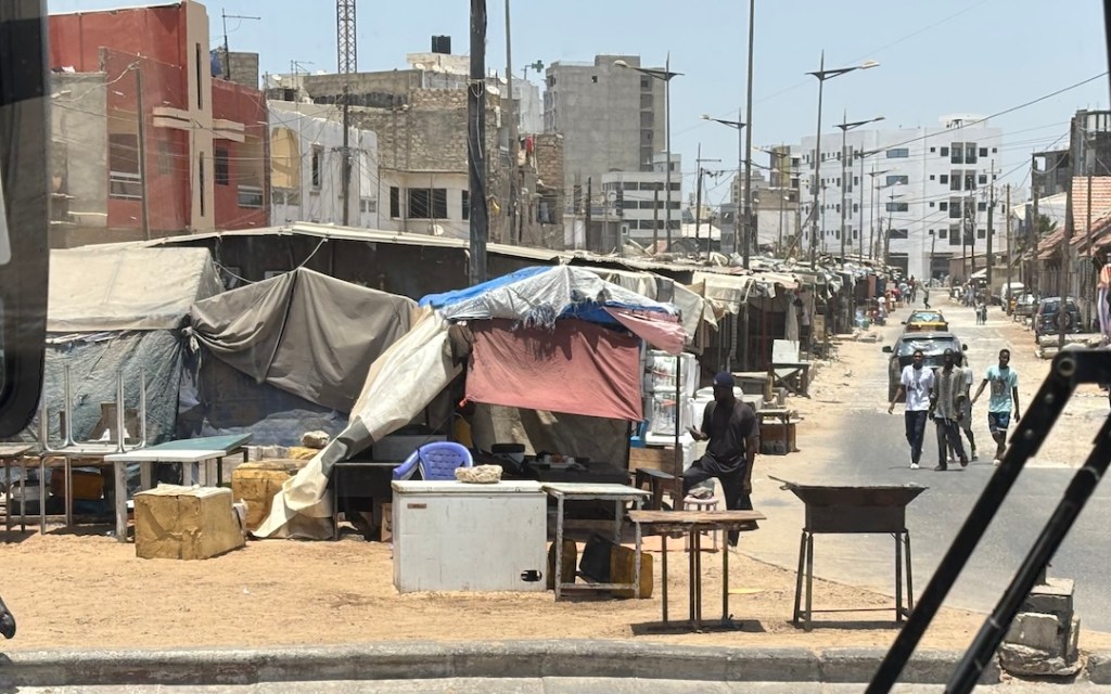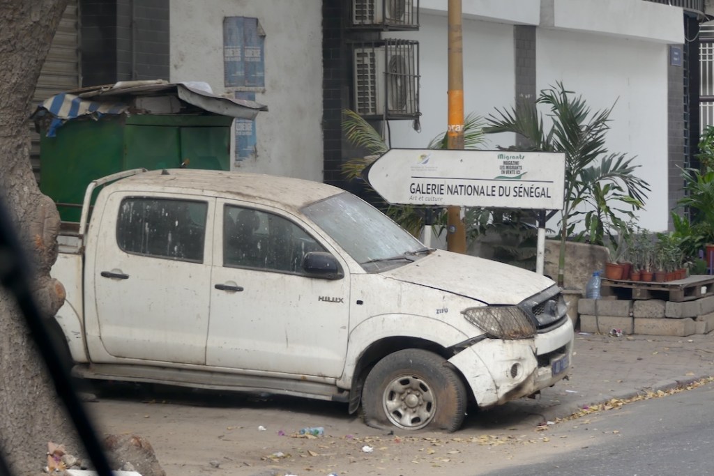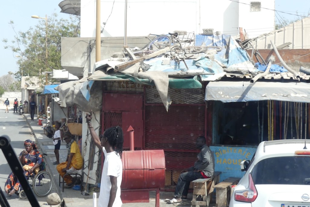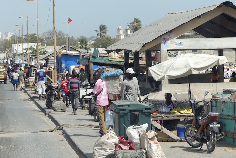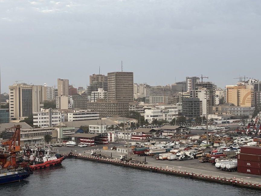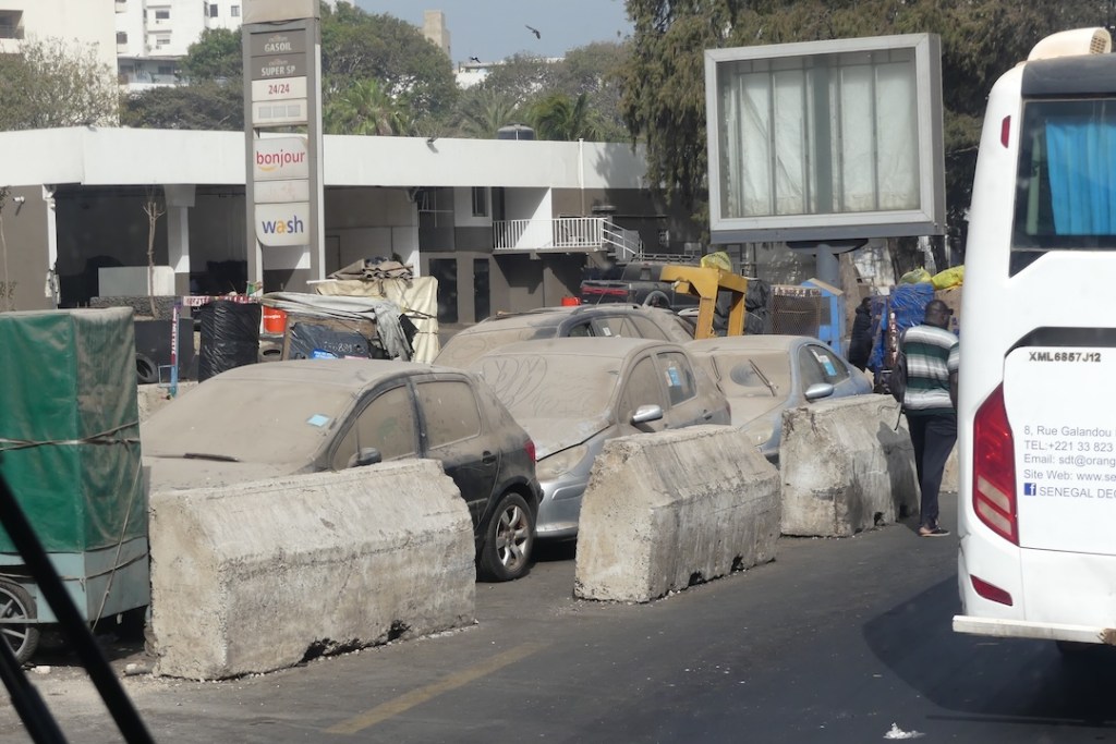 Tyrmistyttävä ja ilahduttava Dakar. Dakarista tuli Senegalin pääkaupunki 1960 ja presidentti Lèopold Sèdar Senghor halusi tehdä kaupungista afrikkalaisen Ateenan. Alla näkymiä: 1. Laivalta nähtynä, iso kaupunki, korkeita taloja. 2. Miten tuosta autosumasta saa pois tarvittavan, vaiko ei tarvita? 3. Bussit poimivat meidät laivan edestä. Varastorakennuksen viereen olivat kauppiaat asettuneet jo aamuvarhaisella. Terminaalirakennus on suunnitteilla, mutta hyvin kaukaisessa tulevaisuudessa. Eihän sitä tarvittukaan.