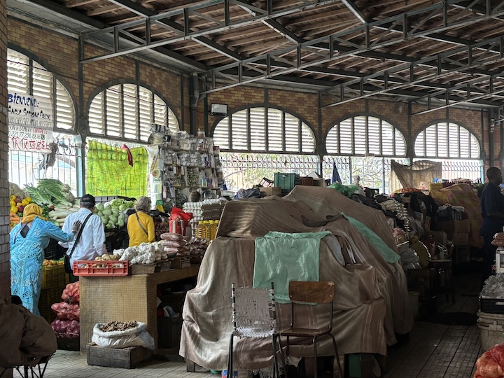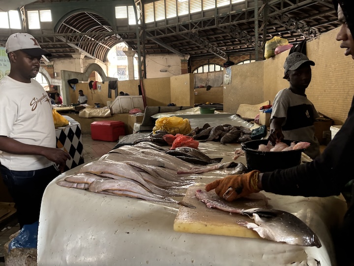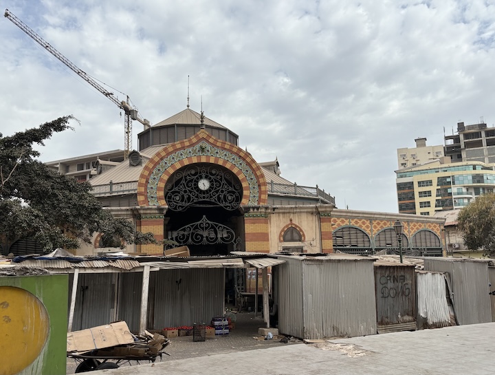 Astuimme sisään valtavaan halliin, vihannes ja kalamarket, joka oli pantu pystyyn entiseen moskeijaan komean kuvun alle.