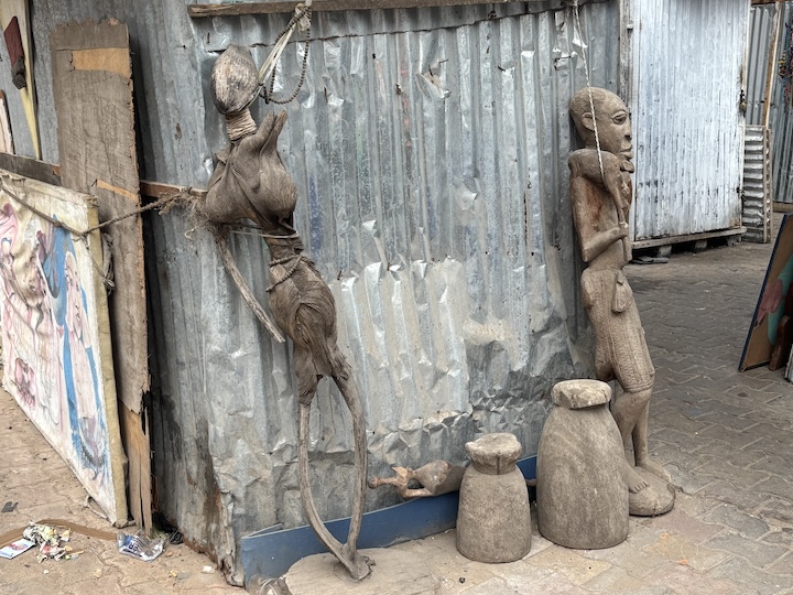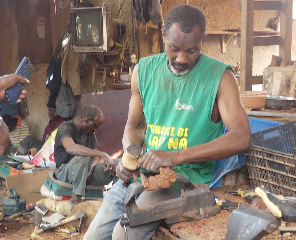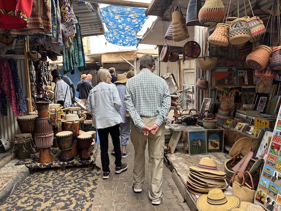 Opas viittoi seuraamaan, ja jälleen olimme keskellä myyntikojuja ja kujia. Ompelukoneen takana mies, ja mekkoa ja paitaa syntyy myytäväksi. Taidokkaita puuveistoksia tehdään käsityöläisten majoissa koko suvun voimalla. Montako norsua ja kirahvia mahtuu matkalaukkuun kotimatkalle?