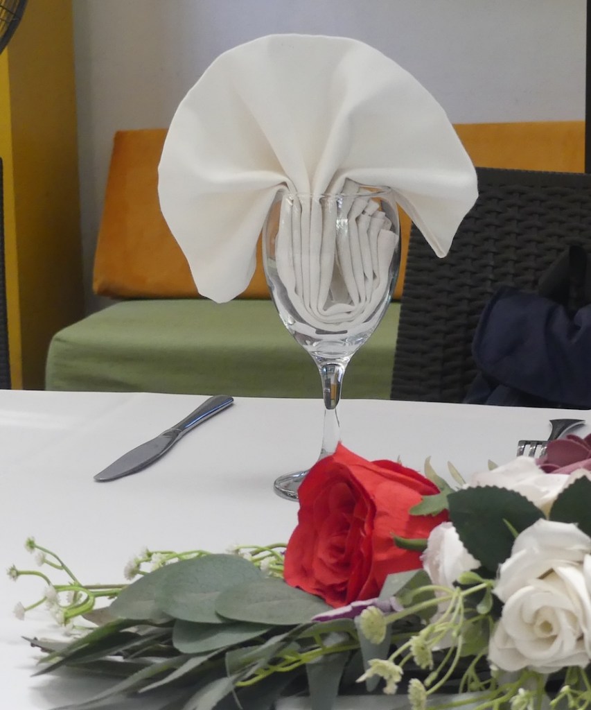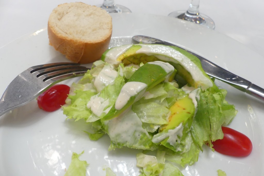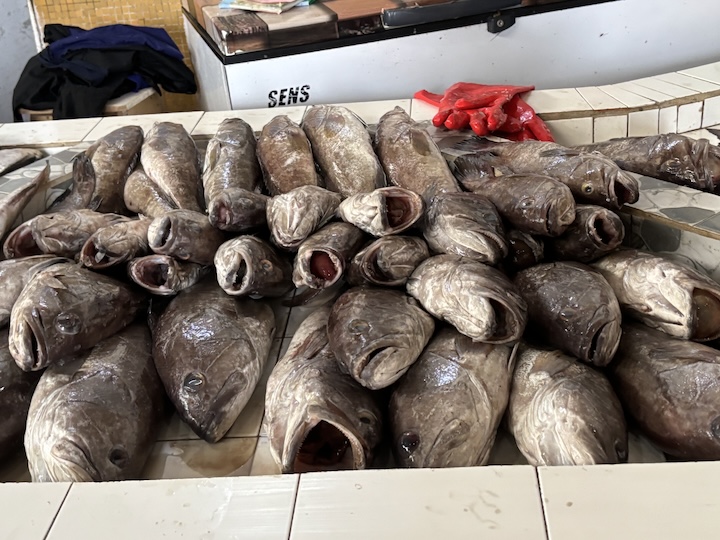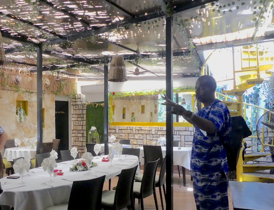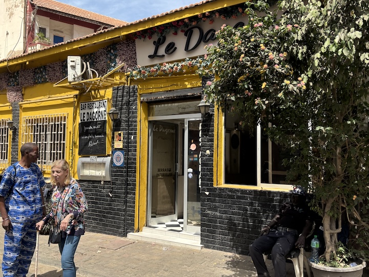 Meille oli luvassa lounas afrikkalaisessa Le Dagorne ravintolassa. Bussi pysähtyi kadulle, jossa olimme aamulla ihailleet kaupankäyntiä. Kalan löyhkä on ja pysyy ilmassa, sen haistaa jo kaukaa. Jälleen mielessä kävi hienoinen epäilys, mutta oppaan perästä astuimme rohkeasti sisään ovesta, ja suureksi hämmästykseksi edessämme oli mitä kaunein ja siistein ravintolasali, pöydät katettu kukkasin ja lautasliinoin. Avokadosalaatti, kalaa tai kanaa, jälkiruuaksi flan tai hedelmäsalaatti, lasi viiniä tai afrikkalainen olut, ja lopuksi espressokahvit. Aivan ihana maukas lounas, keidas keskellä pölyistä kaupunkia.