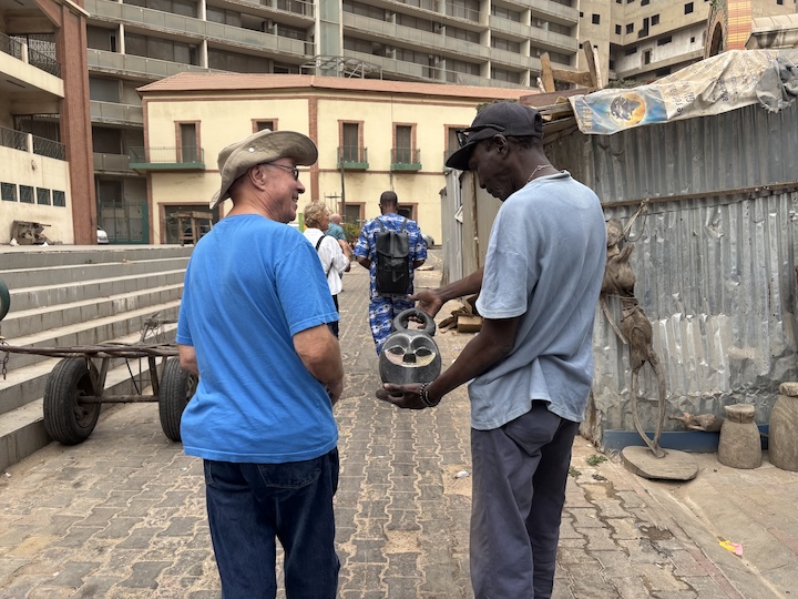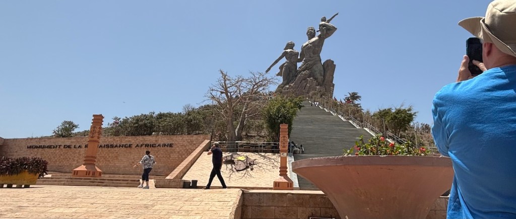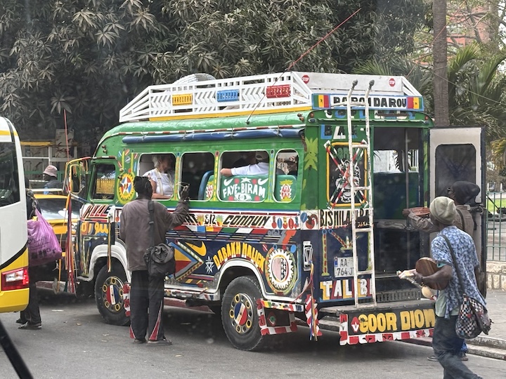 Satamasta nousimme ihan tavalliseen turistibussiin. Me 22 urheaa ja uteliasta lähdimme kierrokselle nimeltään: Discover Dakar: History, Art and Culture. Otsikko kaiketi antaa mielikuvan muutamasta taidenäyttelystä ja paljosta puheesta. Päivän anti oli yhtä yllättävä kuin koko Afrikka. Oppaanamme bussissa toimi pitkä, laiha, sinivalkoiseen kaapuun pukeutunut, englantia senegalilaisittain puhuva paikallinen mies, Sylvestre nimeltään. Matkan varrella hän osoitti taloa, jossa kertoi syntyneensä, ja jossa hänen sukuaan edelleen asuu. Sylvestre osoittautui hyvin tietäväksi, ja hyvin, hyvin ylpeäksi maastaan ja kaupungistaan.
