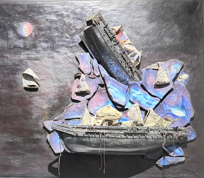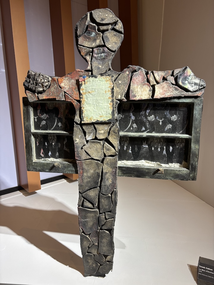 Afrikkalaisuutta kuvaavat taideteokset täyttivät toisen kerroksen. 1. Afrikasta lähteneistä laivoista on moni uponnut Atlantin aaltoihin. 2. Ilmoitus orjien huutokaupasta South Carolinassa. 3. Vapauden aurinko.