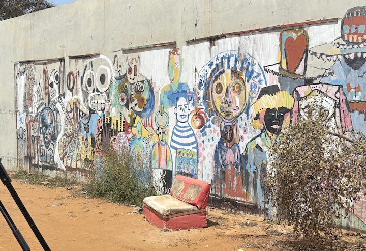 Bussi pysähtyi kadun varteen ja opas kertoi, että tehdään kävelyretki, hän haluaa näyttää meille paikallista arkkitehtuuria. Ok, siis seuraamme tiivisti opasta, omine aikoineen ei olisi tullut mieleenkään lähteä moisille kaduille. Hiekka oli haudannut alleen kadunvarren roskat, irronneen laatoituksen, hylätyt autot renkaat tyhjinä, ja loputtomat romuläjät. Kulman takaa bongasin paikallista taidetta.