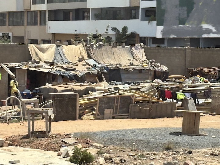 Silmät pyöreinä katselimme bussin ikkunasta kuoppaisen kadun varren ihmispaljoutta ja loputtomia hökkeleitä. Teitten ja suurempien katujen varsilla jatkui hökkelirivistöjä loputtomasti. Romua ja roinaa kaikkialla, kaikki paksun hiekkakerroksen alla. Se ei nähtävästi häirinnyt ainakaan opastamme hänen esitellessä meille ylpeänä afrikkalaista kulttuuria ja sen tuotteita. Oli sunnuntai-aamu, mutta autot suhahtelivat vauhdilla ja liikennevaloja ei juuri ollut haittana. Isoimmat kaupungin läpi johtavat tiet oli eroteltu betonivallilla. Alla kuva siitä, miten katu ylitetään.