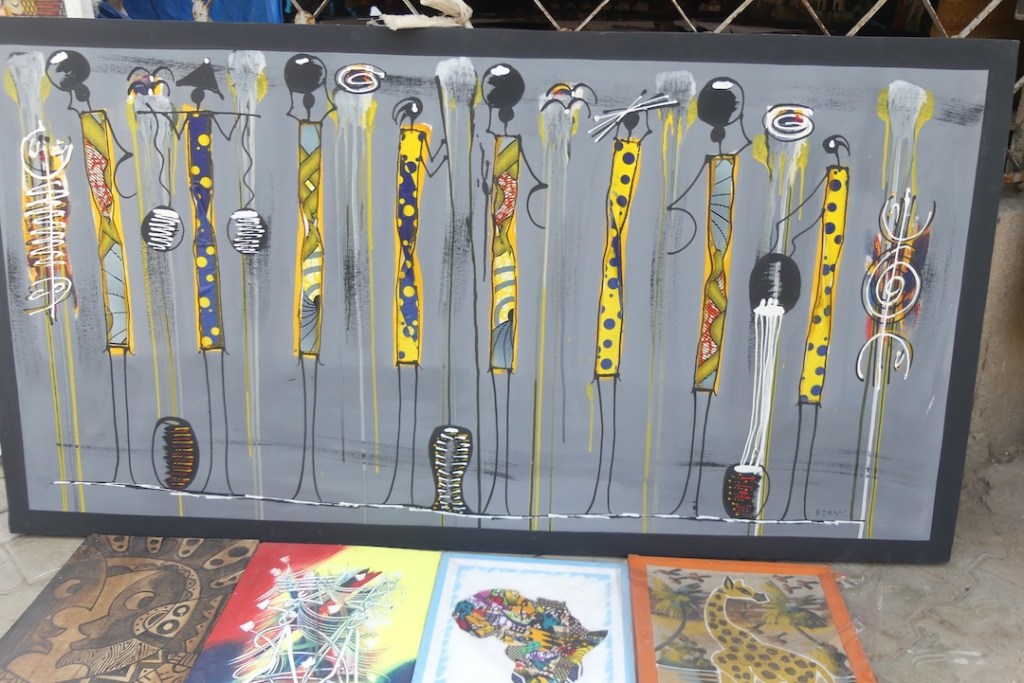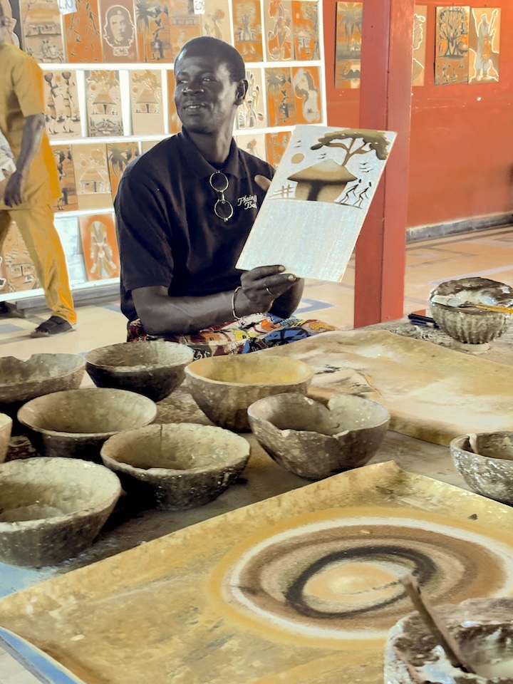 Suuren ja kunnioitetun Baobab-puun, olisiko suomeksi apinanleipäpuu, juurelta löytyi hiekkaa ja faneria materiaalinaan taidetta tekevä Sand Art paja. Kuva maalataan fanerille baobab puusta saatavalla liimalla, eri väristä hiekkaa ripotellaan päälle, loput kaadetaan pois, ja taiteilija esittää ylpeydellä teostaan. Taidolla ja halvalla syntyy kauniita kuvia, meillekin yksi tuolta seinältä lähti mukaan.